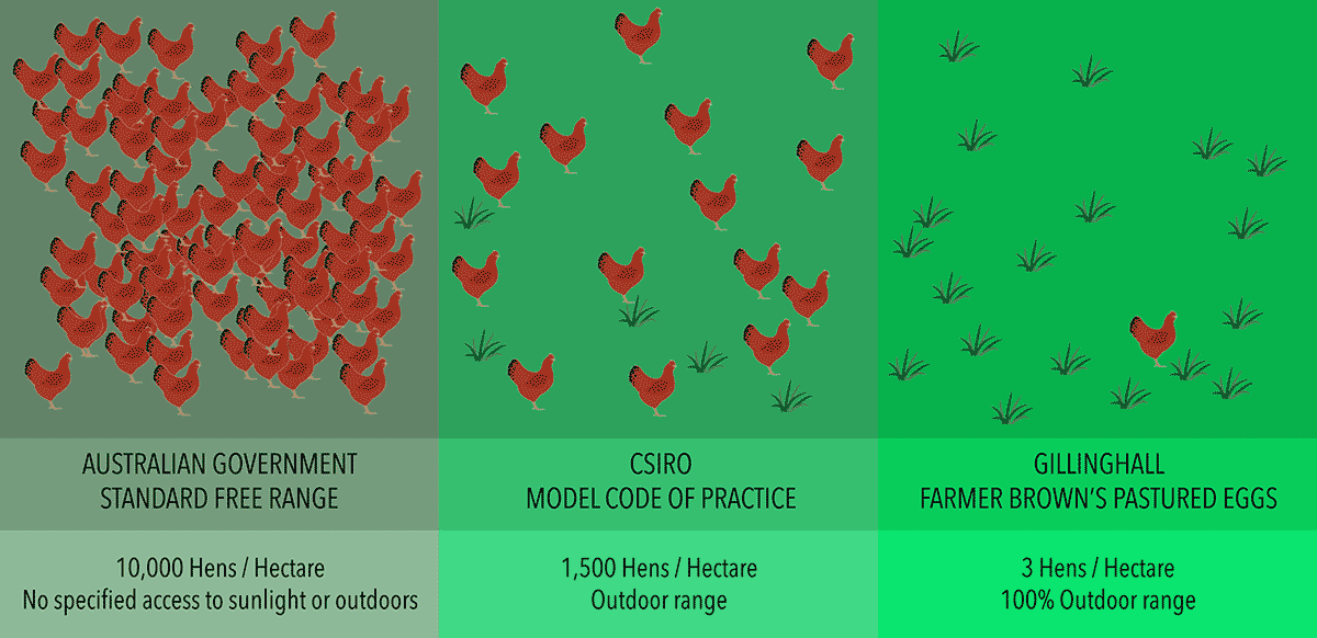 With a stocking rate of only 3 hens per hectare Farmer Brown’s happy hens at “Gillinghall” have more room to roam than most. It’s this space, access to sunshine and total freedom to express their hen-ness that leads to our best practice animal welfare standards. The infographic below shows you the difference between free range standards, and pasture raised at Gillinghall.